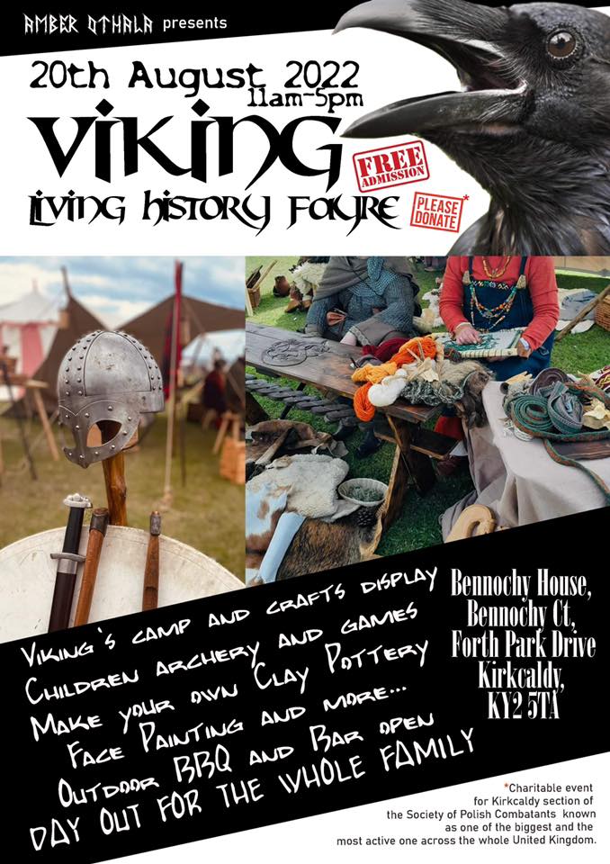 Saturday the 20th of August 1100-1700 Polish Club Kirkcaldy (MAP LINK) FREE ADMISSION PLEASE DONATE Experience the vivid displays of daily life in early medieval encampment! Family Fun Day ! Come and meet Amber Othala Vikings in their living history encampment. Order drinks from Bennochy House Bar and enjoy the food from outdoor BBQ. What…(Read More)